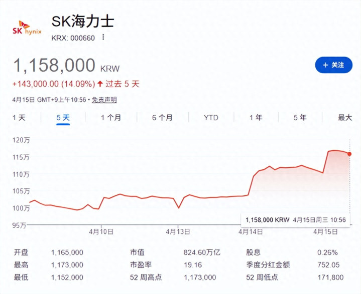 SK海力士多日连续大涨,14日一度飙升近9%,达到112.8万韩元,创下历史新高,最终收涨6.03%。
