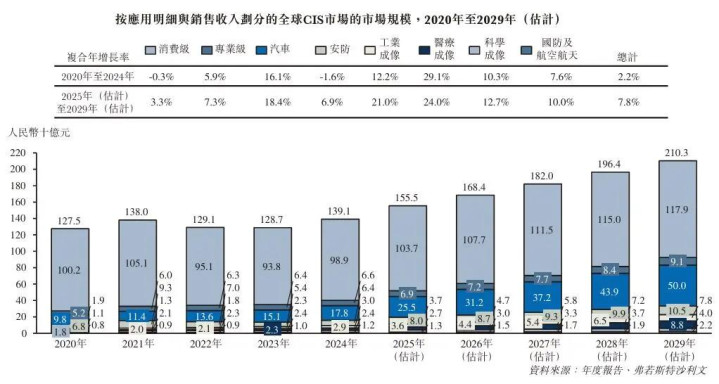 那么,长光辰芯所处的赛道究竟有多大?根据弗若斯特沙利文报告,2020年至2024年全球CIS收入由1275亿元增至1391亿元,复合年增长率约2.2%。其中,工业成像、科学成像CIS市场2024年的收入分别占全球CIS市场的2.1%和0.8%。