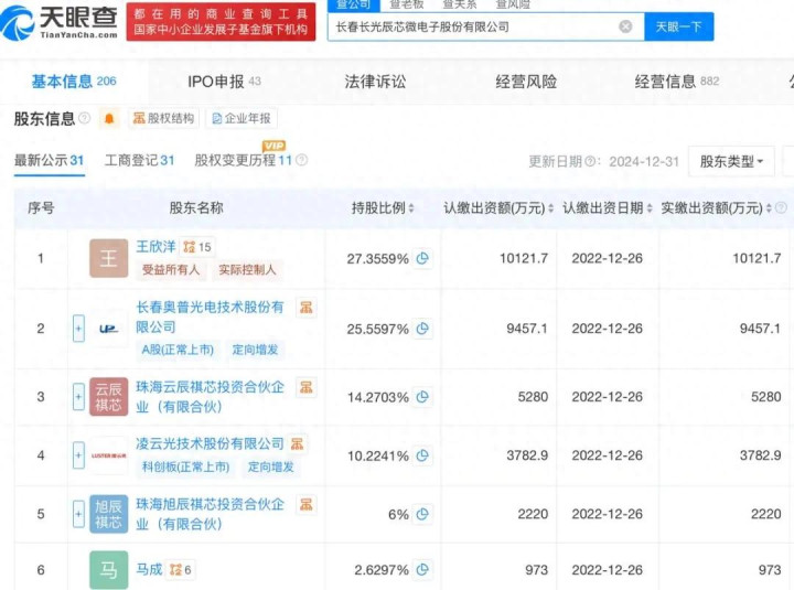 天眼查App信息显示,长光辰芯成立于2012年9月,前身为长春长光辰芯光电技术有限公司。目前,该公司的注册资本为3.7亿元,法定代表人为王欣洋,主要股东包括王欣洋、奥普光电等。